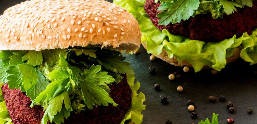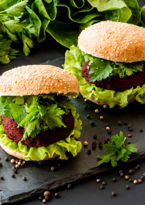Извадете, когато е готово, и сервирайте върху бутерки с кориандър, растителна майонеза, резени лук, маруля и резен домат.