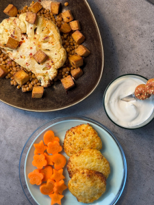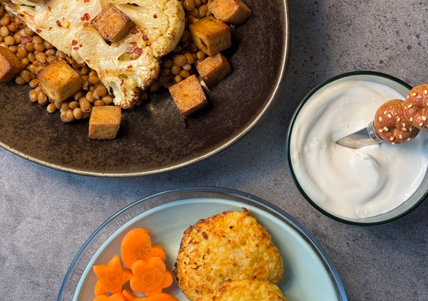 - След като всичко е готово поставете сварената леща в чиния и я сервирайте като основа. Подредете върху нея хапките от карфиол и стековете с тофу. Полейте със сос на основа на кисело мляко. Добавете свеж зеленчук по избор за освежаване на ястието.