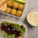 - Оформете малки хапки от сместа и ги поставете в първата кошница на еър фрайъра. Изберете функция Air Fry на 180 за 12-15 минути и гответе хапките докато станат златисти и хрупкави.