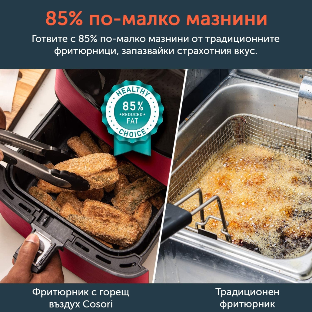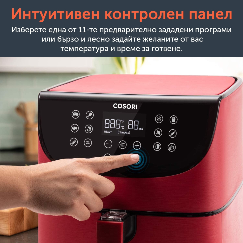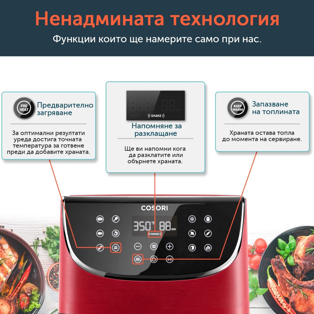 Програмите на Cosori ви дават възможност за предварителни настройки, разработени специално от майстор-готвачите на Cosori, което гарантира запомнящ се вкус на ястията. Функциите за запазване на температурата в уреда и предварително загряване, ви осигуряват изживяване в кухнята от нова висота.