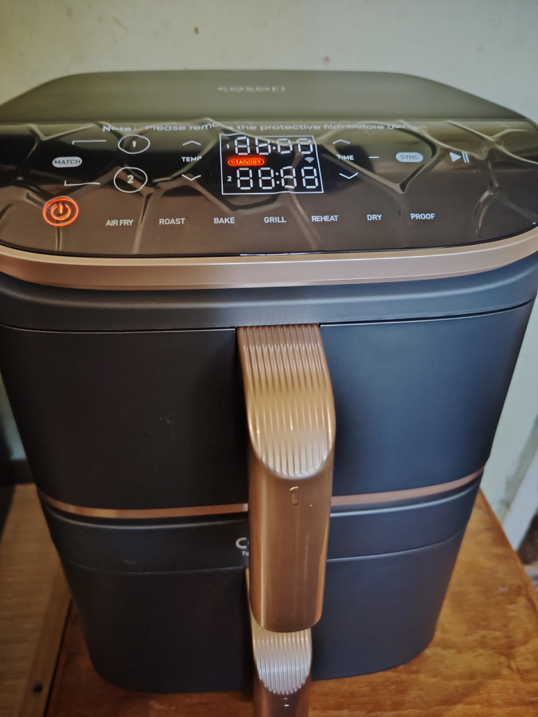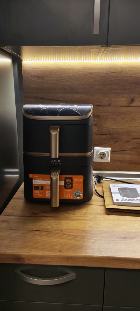 Висококачествен еър фрайър с предостатъчен обем, без да е прекалено голям. Единствената ми забележка в сравнение с едноетажния модел е, че голямата кошница няма настройки за само долен или само горен реотан, което е разочароващо. Може би това може да се добави като опция в приложението? Реално така ще може в двете кошници да се изпекат доста принцеси наведнъж. Сега за това може да се използва само горната кошница, която има само горен реотан.
