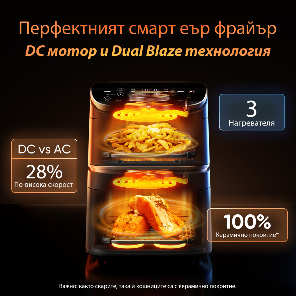 Cosori Turbo Tower Pro — революционният еър фрайър, който променя правилата на домашното готвене. Комбинира иновативно готвене на две нива, Dual Blaze технология за равномерно и прецизно печене, мощен и икономичен мотор с постоянен ток за по-бързи резултати и 100% керамично покритие, което запазва чистия вкус на храната. Създаден да готви повече за по-малко време, по-здравословно и без компромиси.
