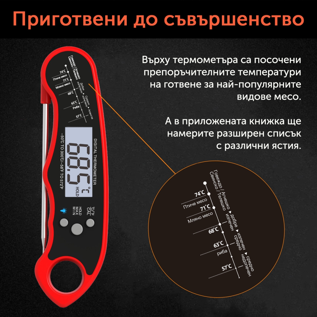 Точно измерва температури от -50°C (-58°F) до +300°C (+572°F). Включва таблица с препоръчителни температури на храната, така че ще знаете дали храната ви е приготвена перфектно!