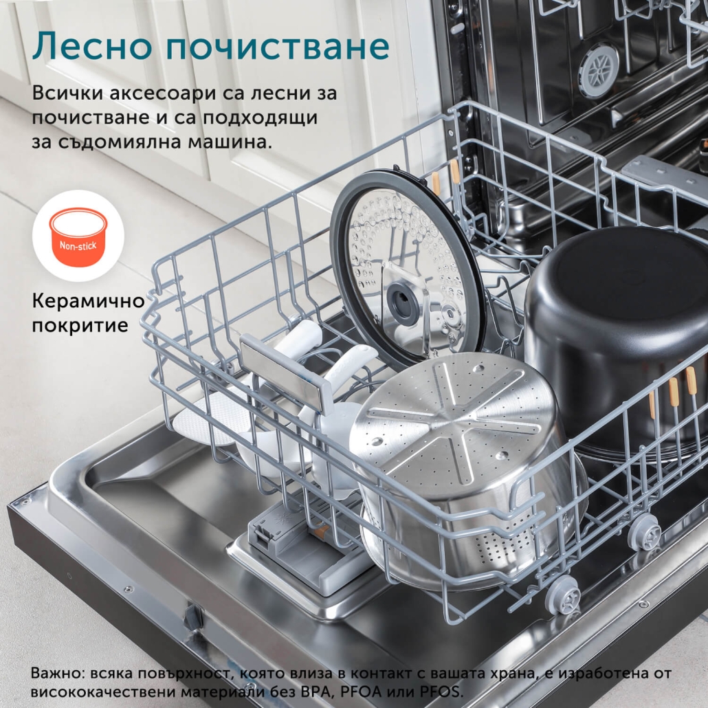 Основният съд, както и всички аксесоари са лесни за почистване и са подходящи за съдомиялна машина.