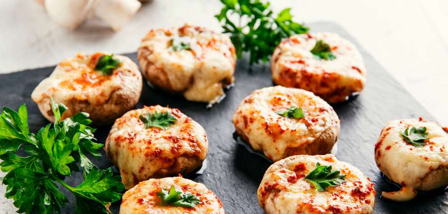 • С лъжица напълнете всяка шапка на гъба със сместа от сирена, като я разпределите леко върху горната част на гъбата.